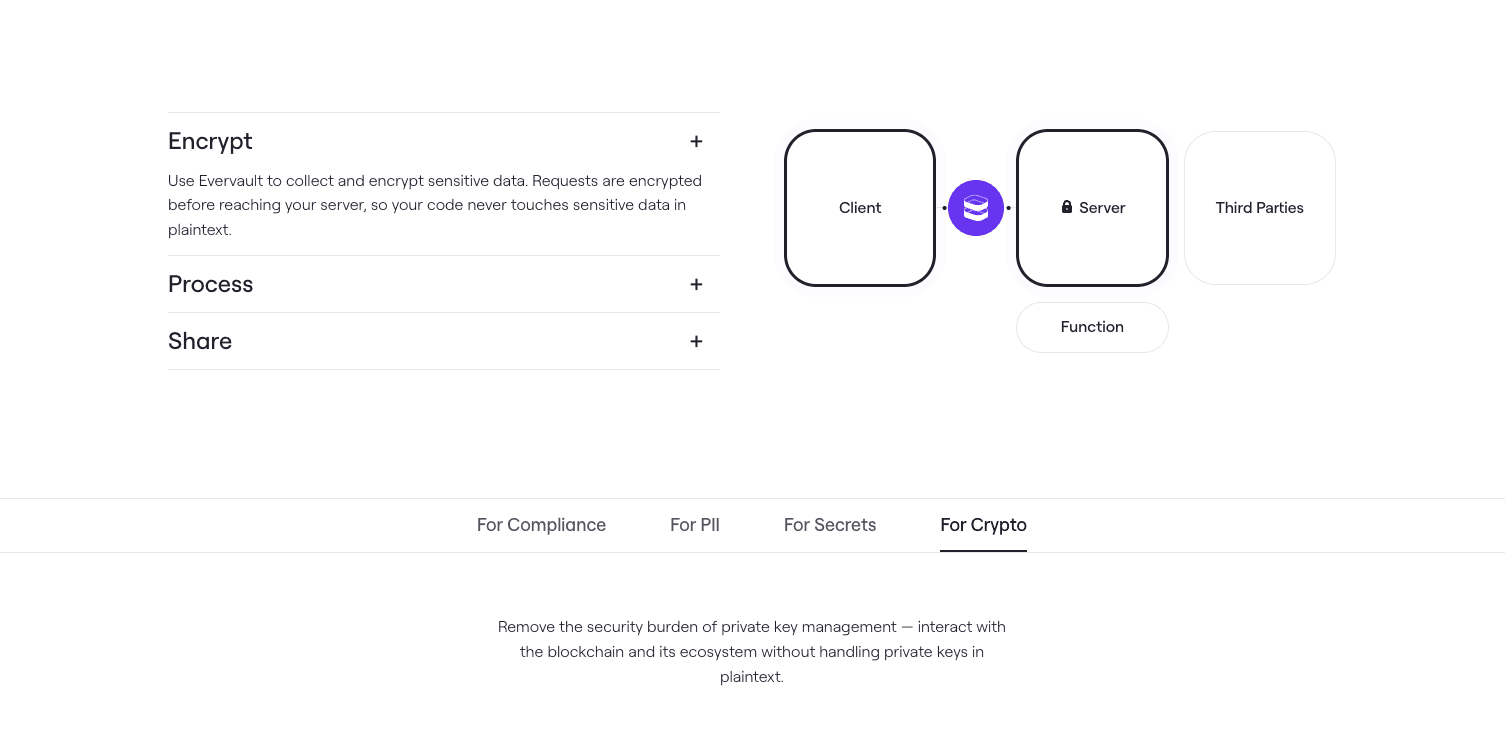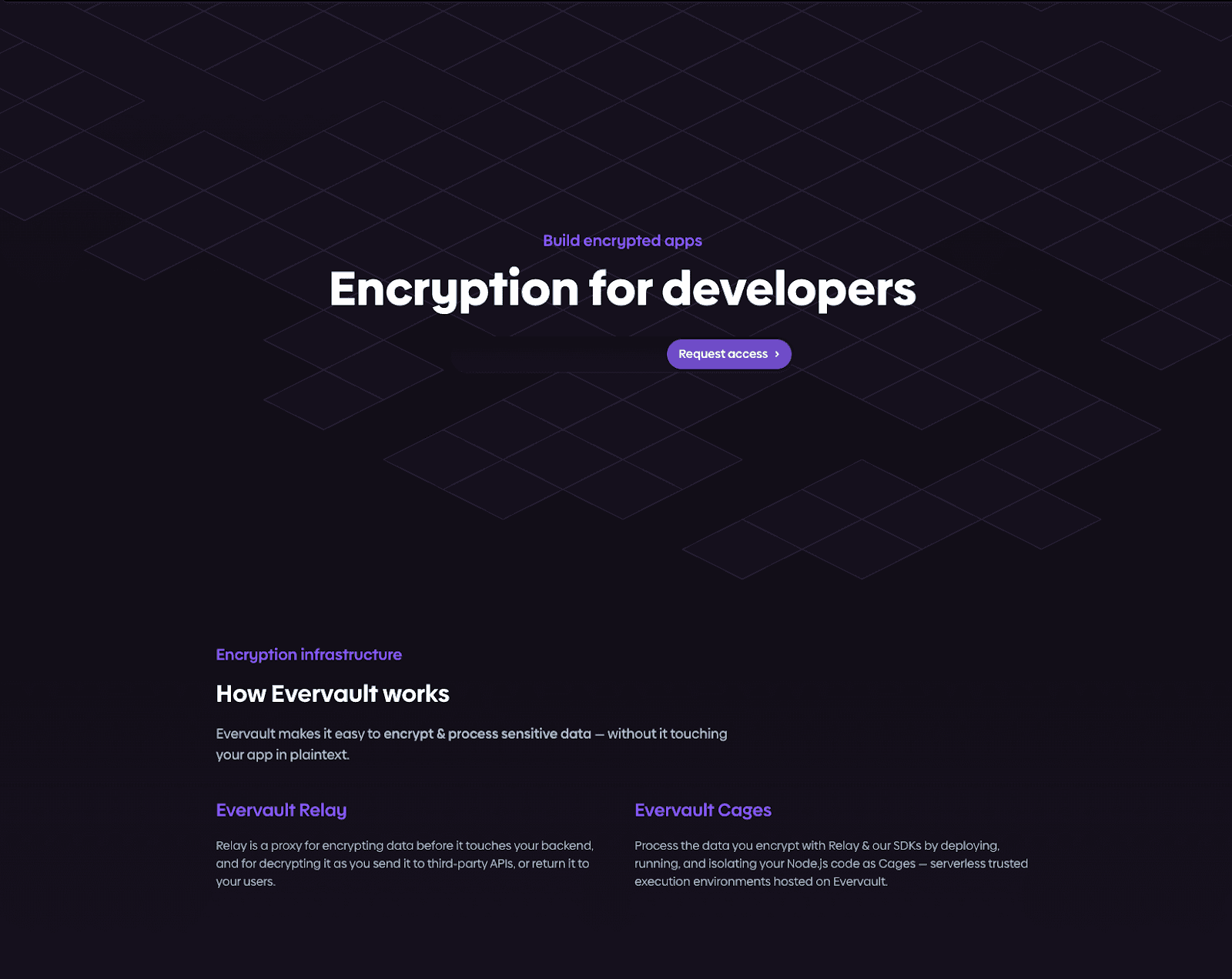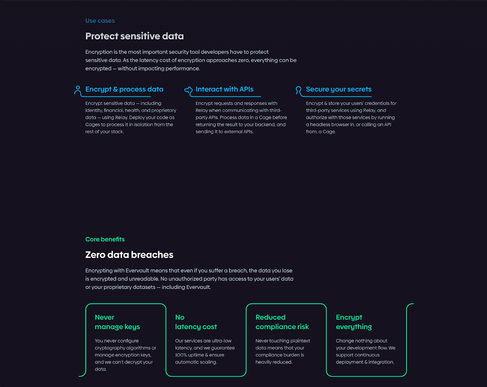 The section above explains how a potential customer might use Evervault to secure their data, but it does so in a very vague way that makes it impossible to imagine what an Evervault implementation looks like. The “Encrypt” section vaguely mentions your code not having to touch plaintext data, although it doesn’t say anything about how that will happen. Nor does it highlight the ease of implementing Relay. It’s interesting to compare it to the Vercel example above, which is trying to achieve the same thing on their homepage. However, it does so using specific examples of what they offer and even code so you can get a better grasp on it.