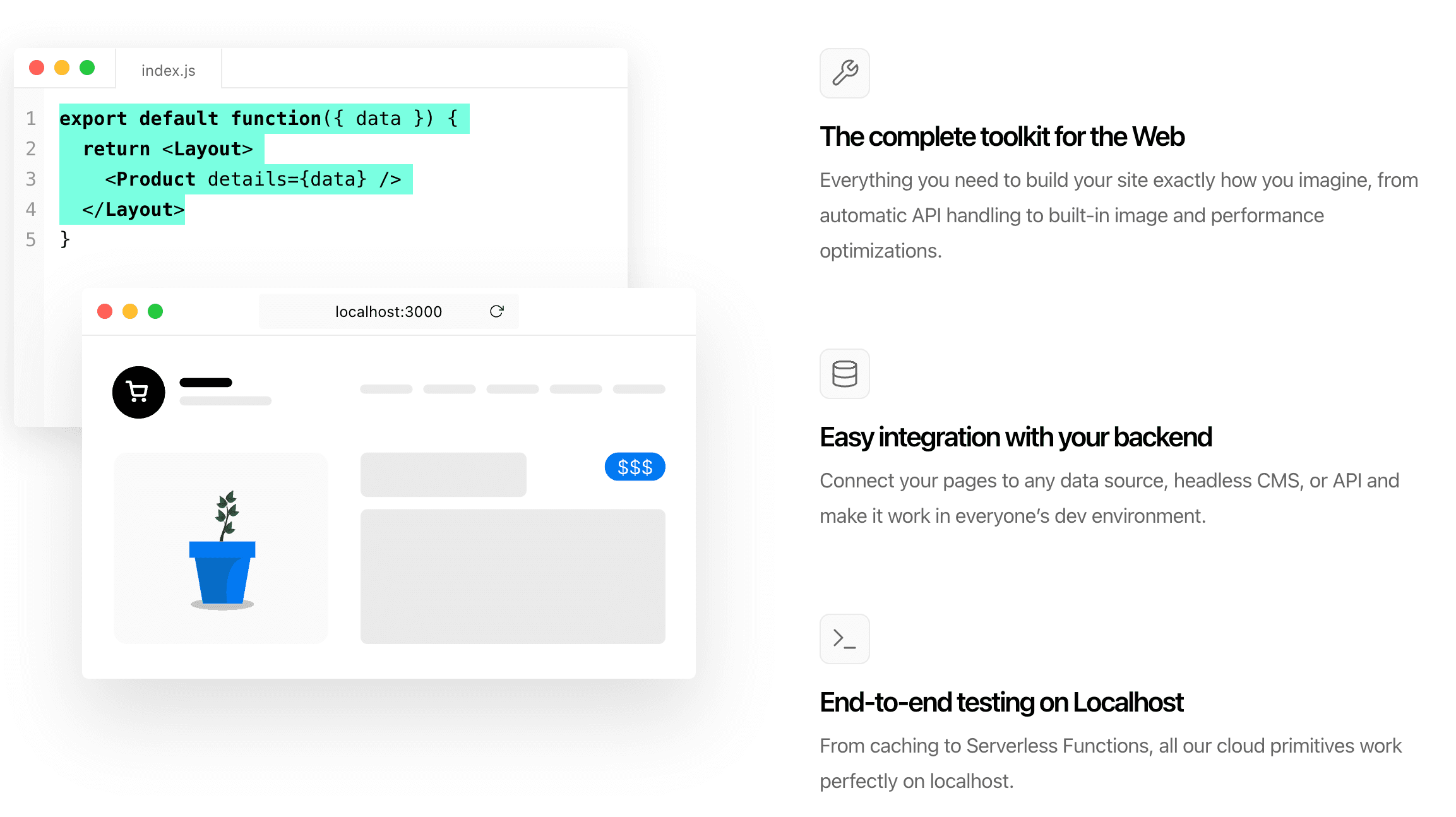 Ideally, the simple demos on your homepage should flow nicely into the beginner tutorials in your docs with a natural progression through the fundamental concepts. Code on your website should be copyable (Vercel does a great job of this), particularly quick scripts that users can copy and paste into their Terminal. It's frustrating for developers to see a piece of code working in an image and needing to transcribe it into your editor to play around with it.
