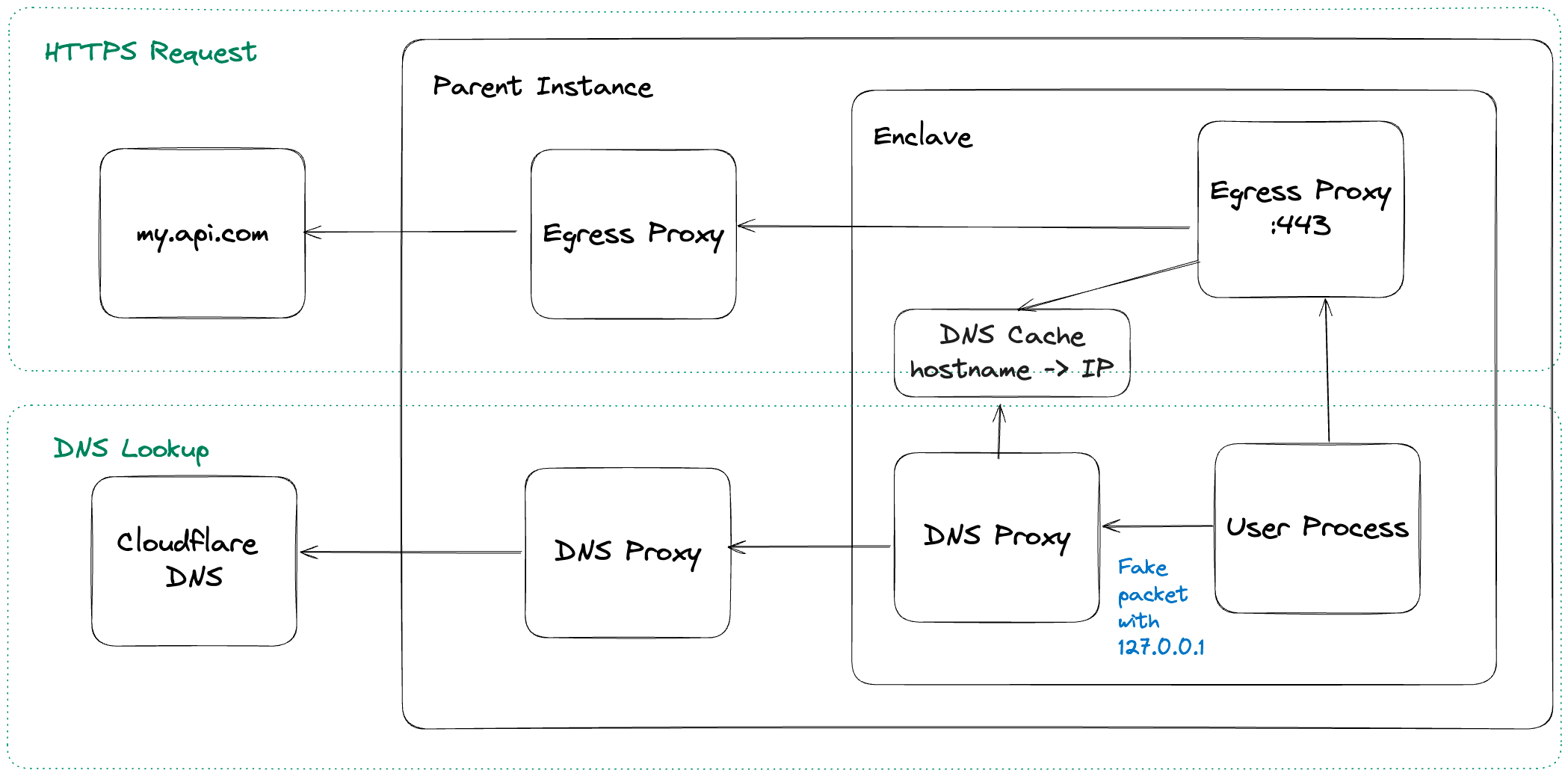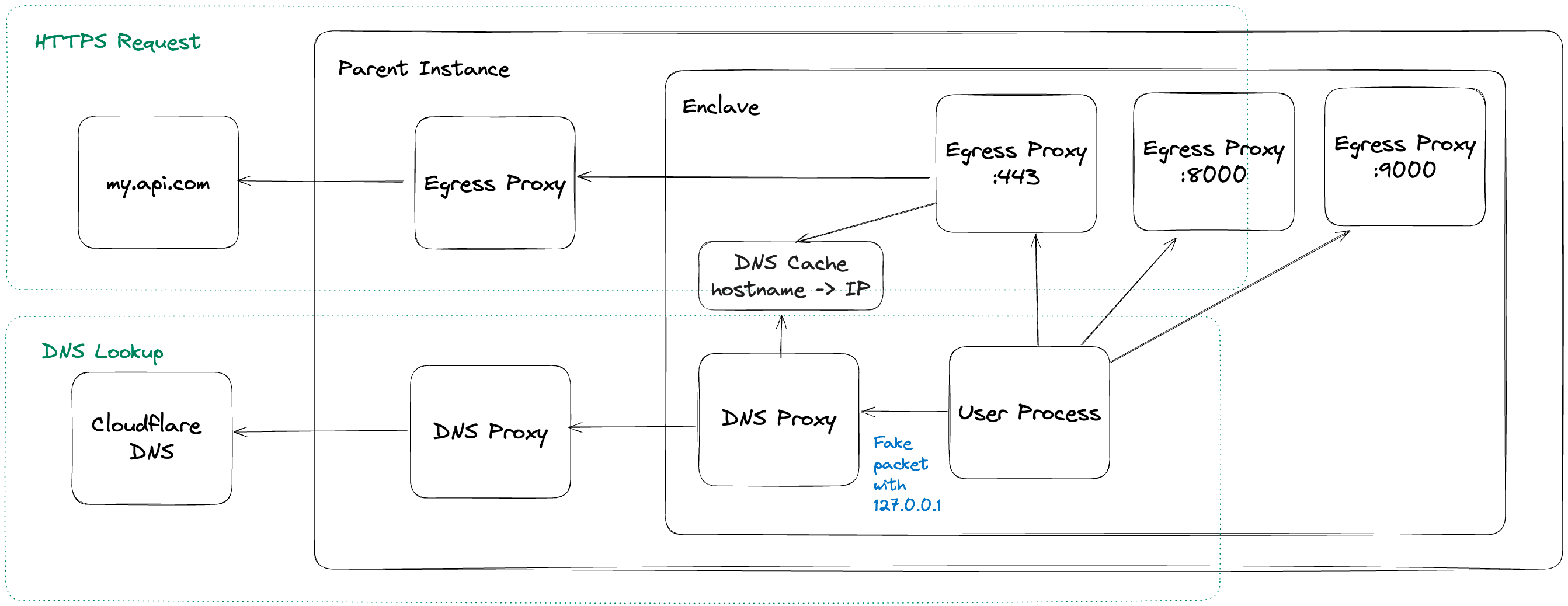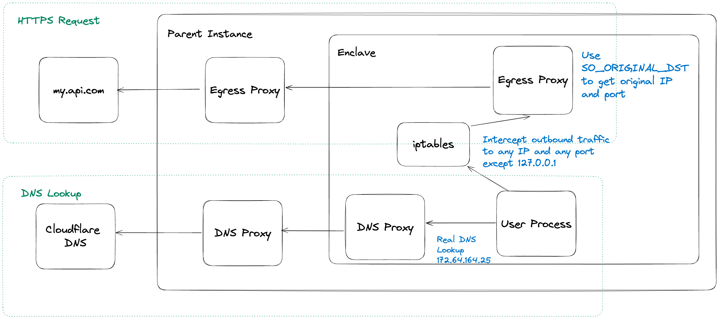 We created an on-Enclave DNS server that would intercept the request from the user process and proxy the request to a remote DNS server over VSOCK. It would then cache the DNS result, create a fake DNS packet with 127.0.0.1 as the address, and send that back to the user process.