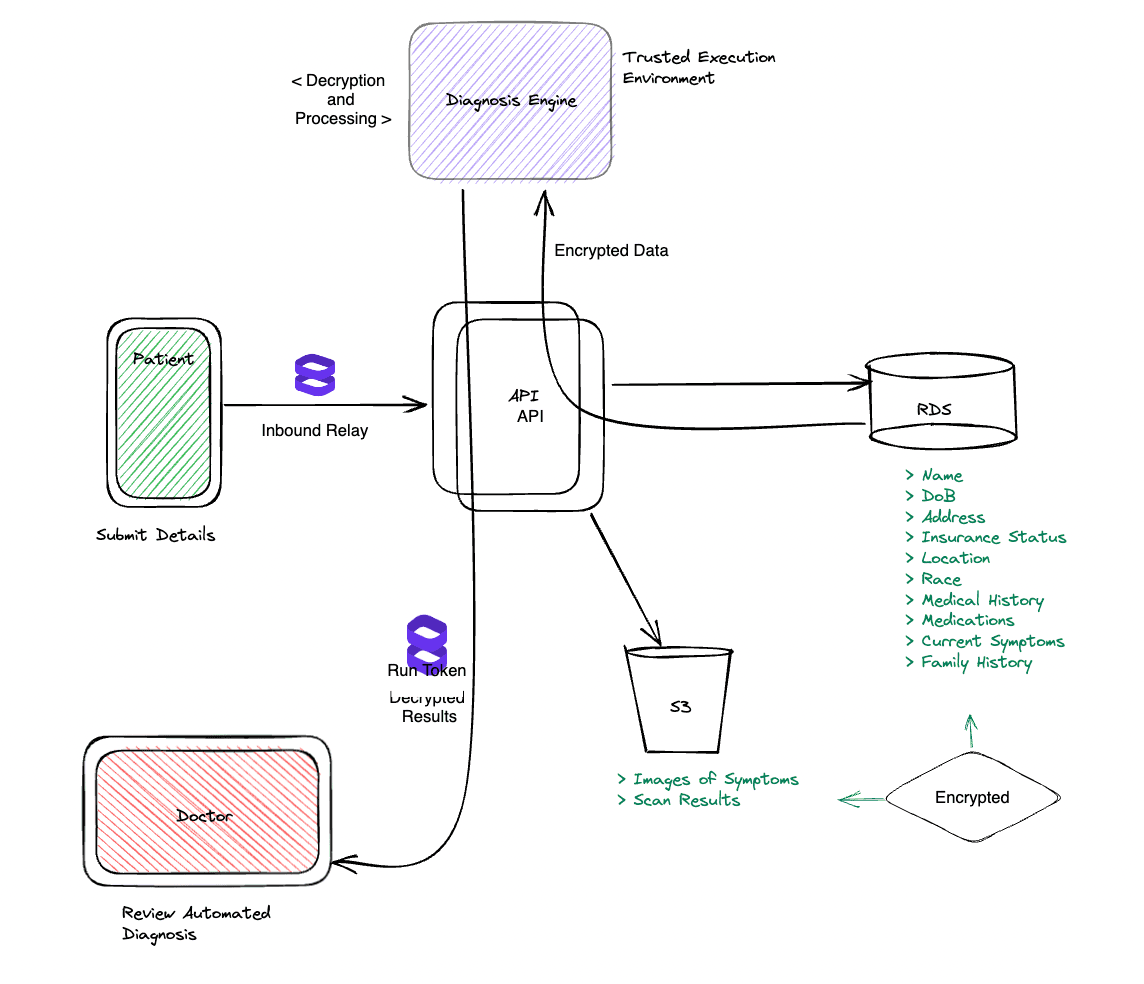 In this reconfiguration, encrypted patient data is sent to the Cage, where it is automatically decrypted and stays protected while it runs against the company’s models. The data is encrypted again once it exits the Cage, and any diagnostic results from the processing can securely be relayed to the doctor for review.