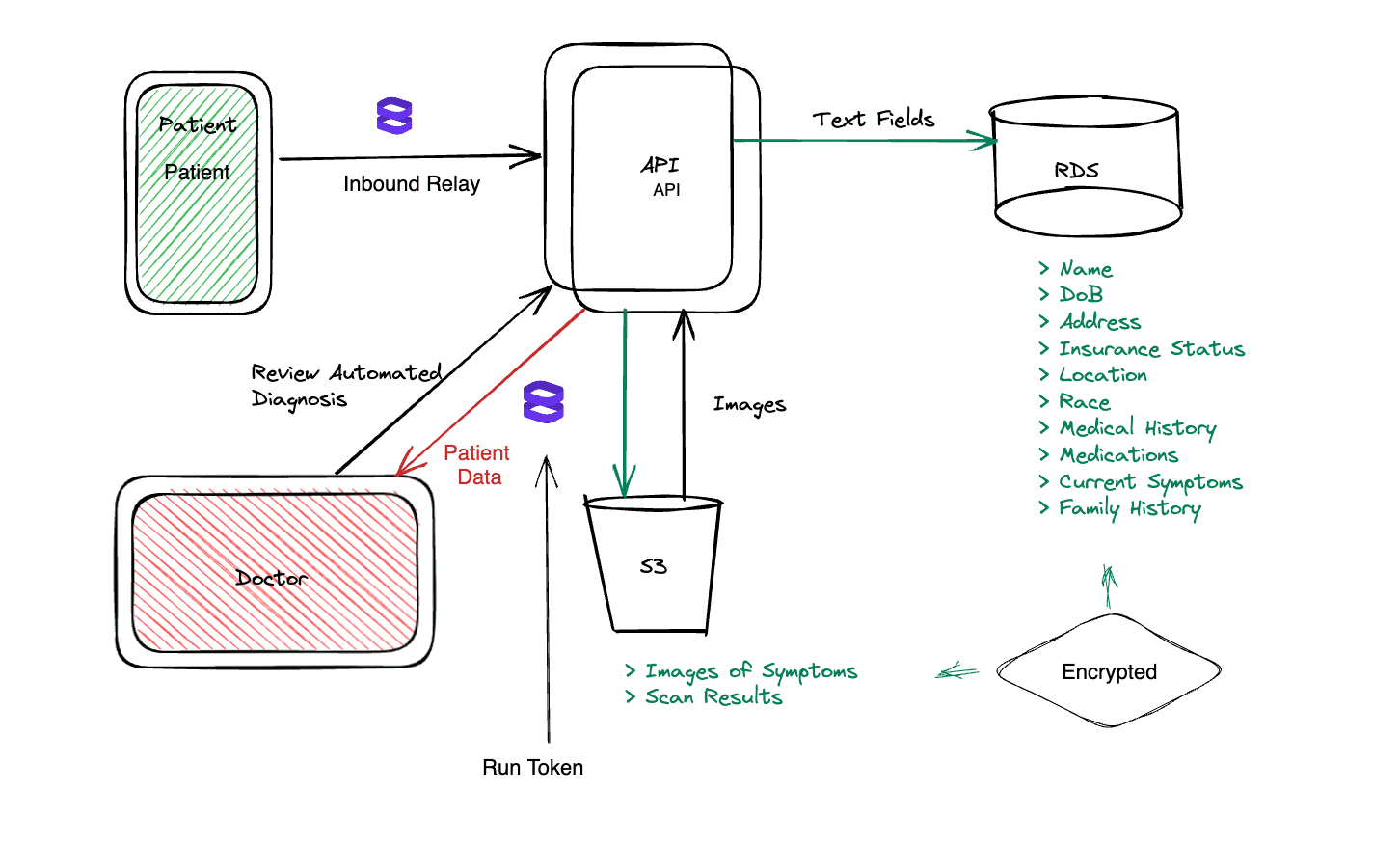 The first step is to ensure that sensitive patient data is encrypted as soon as it hits the healthtech app. With Evervault, the best way to solve this is to use Inbound Relay, a proxy that sits in front of their existing endpoints and intercept the data so it would immediately enter their data flows as ciphertext. An added benefit is that it doesn’t require any code changes on their end, so they are able to select the fields to encrypt that are absolutely necessary.
