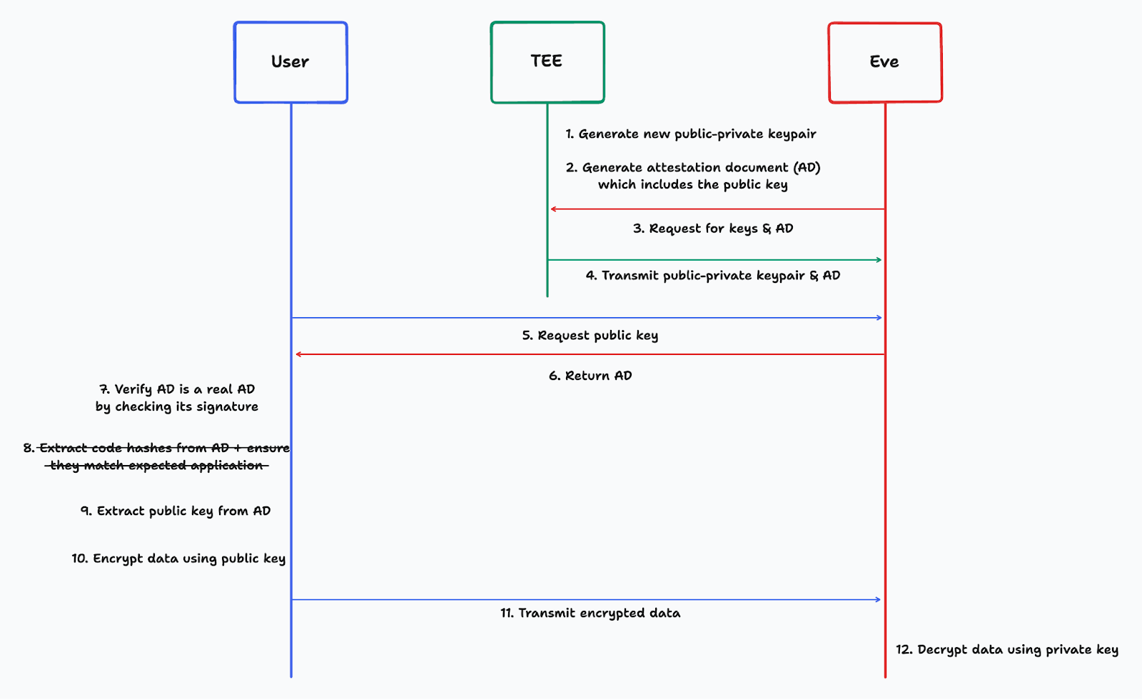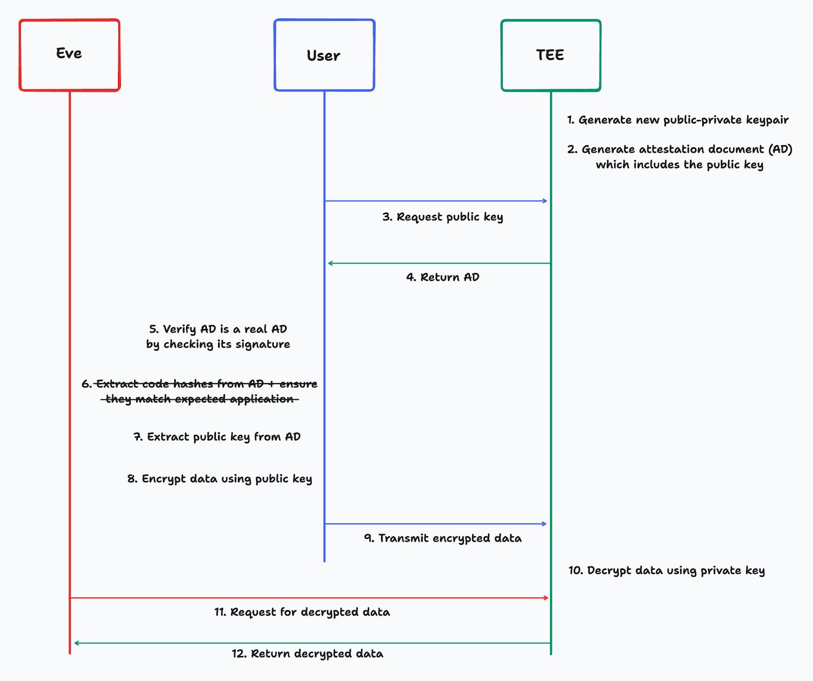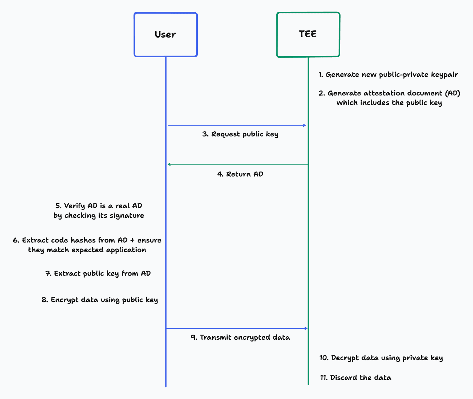 If the user can attest that the application in the TEE only has the functionality shown, the user knows that the data they encrypt using the public key can only ever be decrypted and accessed within the TEE. This attestation is done in Step 6. The user has a hash of the application they expect to communicate with, which is compared with the measurements in the AD before transmitting any private data.