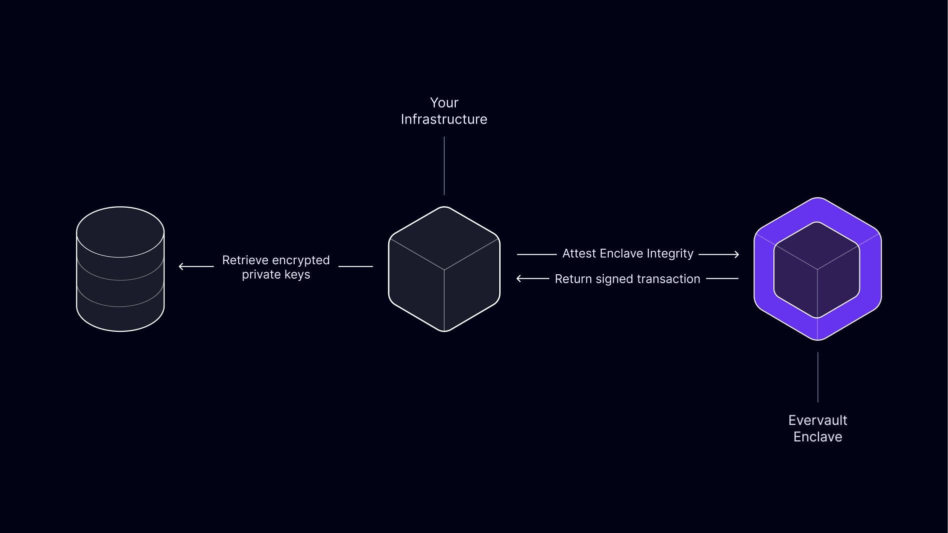 Using Enclaves to address this provides an elegant, trustless solution for handling key operations. Developers can deploy an Enclave which accepts Evervault-encrypted private keys and transaction metadata as an input, and which returns a signed transaction as the result.