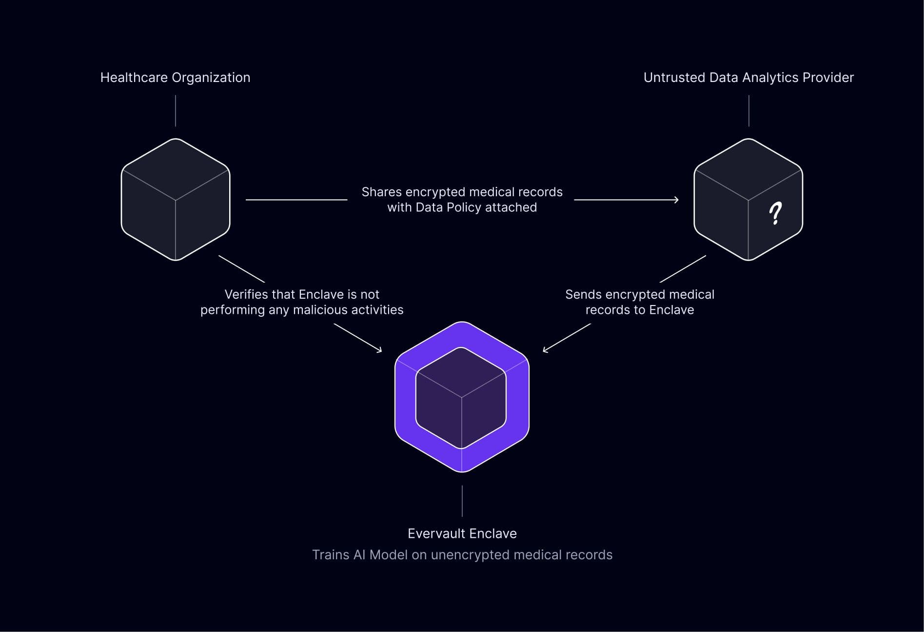 With Evervault, you can do this easily. By sharing encrypted data with the untrusted third-party, in combination with Evervault Data Policies, a developer could ensure that the medical records are processed only by a pre-approved Enclave. Any other attempts to decrypt or modify the data would fail.