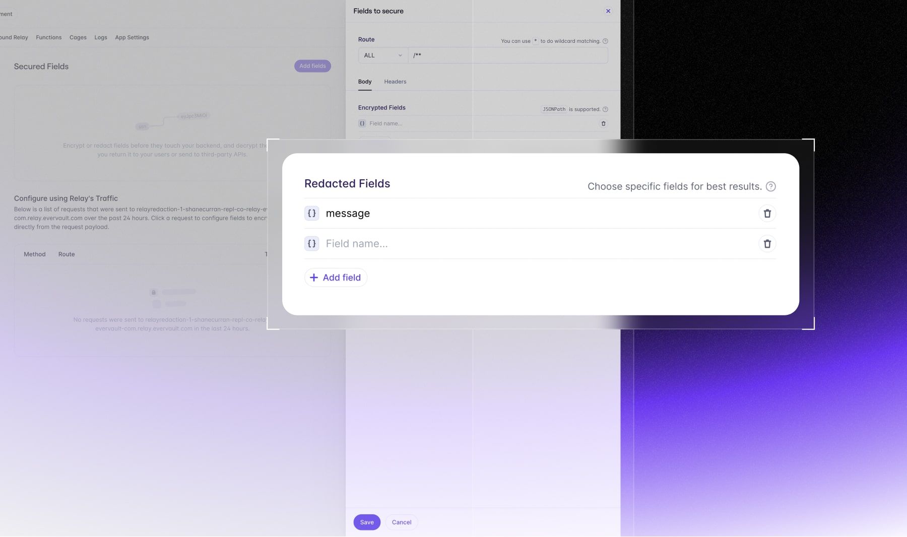 The feature underlying the AI Privacy use case is Relay Redaction. Now when configuring a Relay, you can choose to redact sensitive fields (vs. only encrypt) and Evervault will automatically redact then replace them with synthetic data.