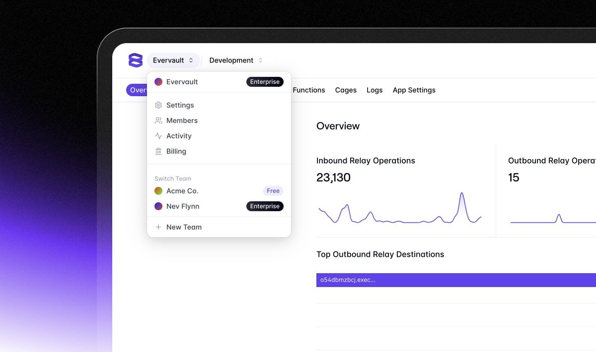We also pencilled in some time to restructure the navigation system to improve usability. It’s now easier to navigate around the Dashboard and switch between different Teams, Apps, and Resources. Create an Evervault account to try it out for yourself.