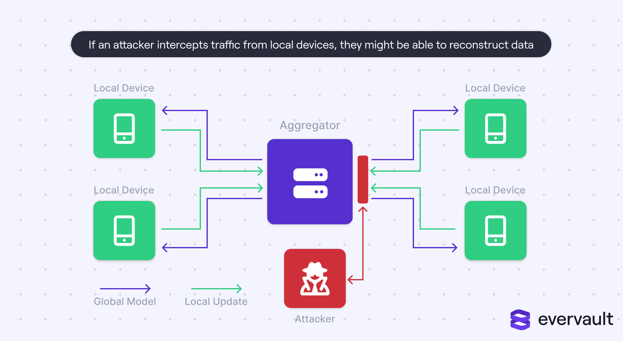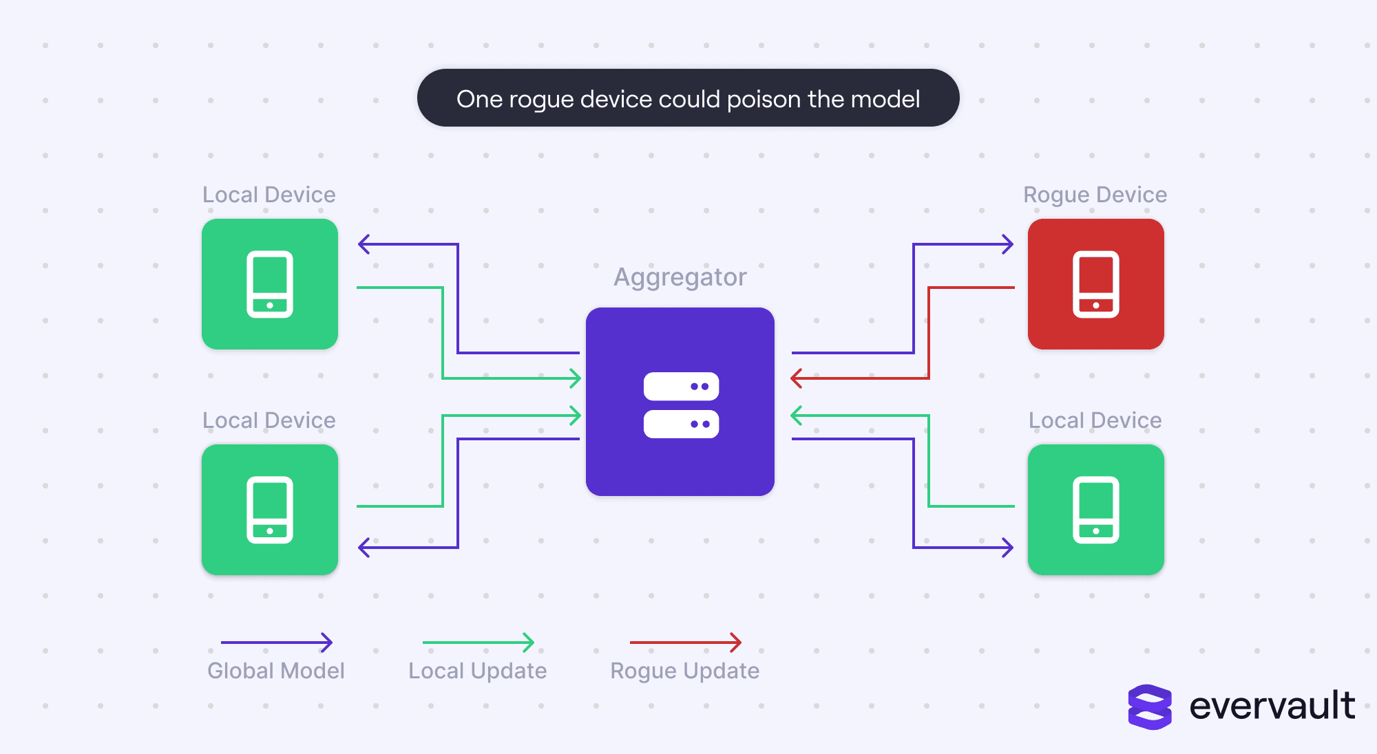 The aggregator is the service doing the machine learning. An aggregator could be “breached” if an external attacker exploits their federated learning program, contributing bad data (known as poisoned data) that ruins the model’s efficacy.