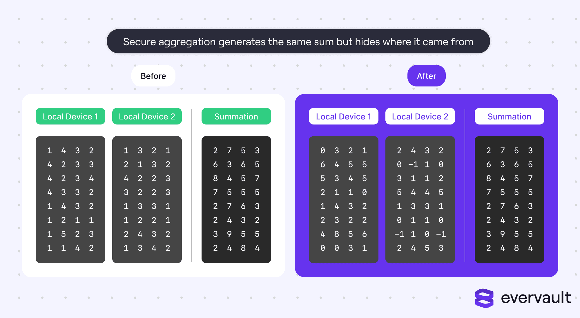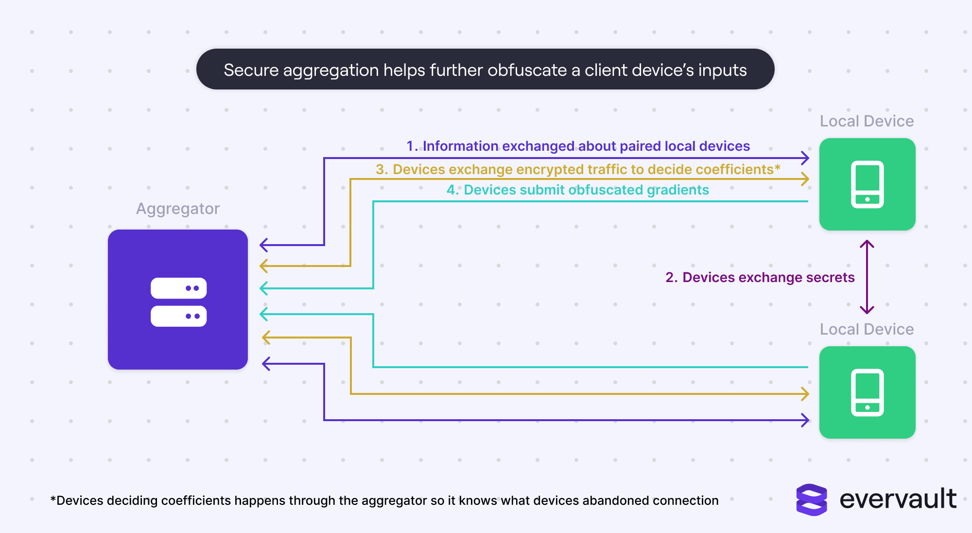 Secure aggregation involves client devices directly communicating with each other to share secret keys, and then using those keys to encrypt traffic proxied through the central server. The client devices will securely communicate to sum their values, allowing the server to absorb the model updates into the global model without knowing which client devices contributed which values.