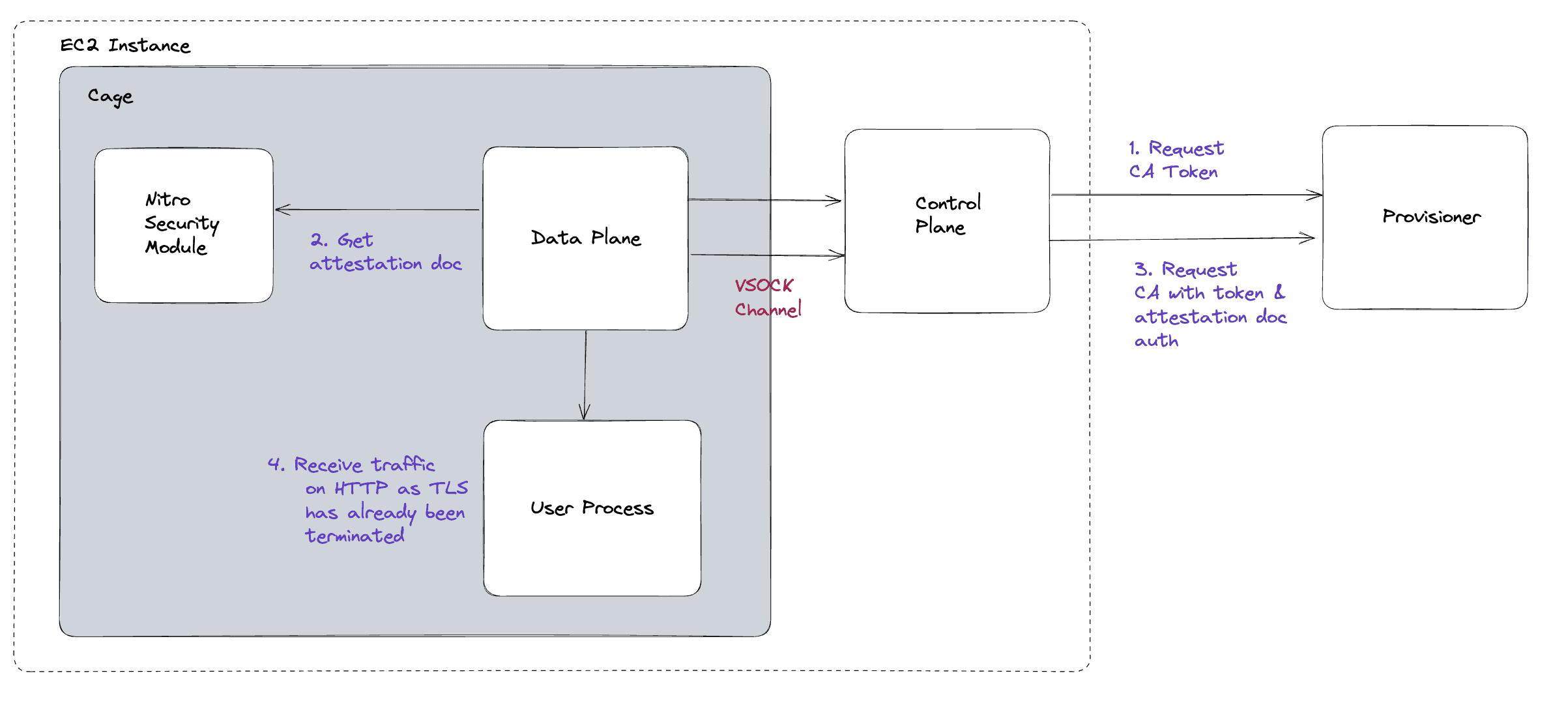 We knew we would need to inject a cert for the Cage’s domain on startup to allow TLS termination to happen in the data plane. However, because the attestation document embedded in the SAN extension will expire after three hours, the Cage would need to request a new cert regularly to keep the attestation document valid. Instead of sending a new certificate regularly, we provision an Certificate Authority (CA) on startup to allow the Cage to regenerate certs when necessary.