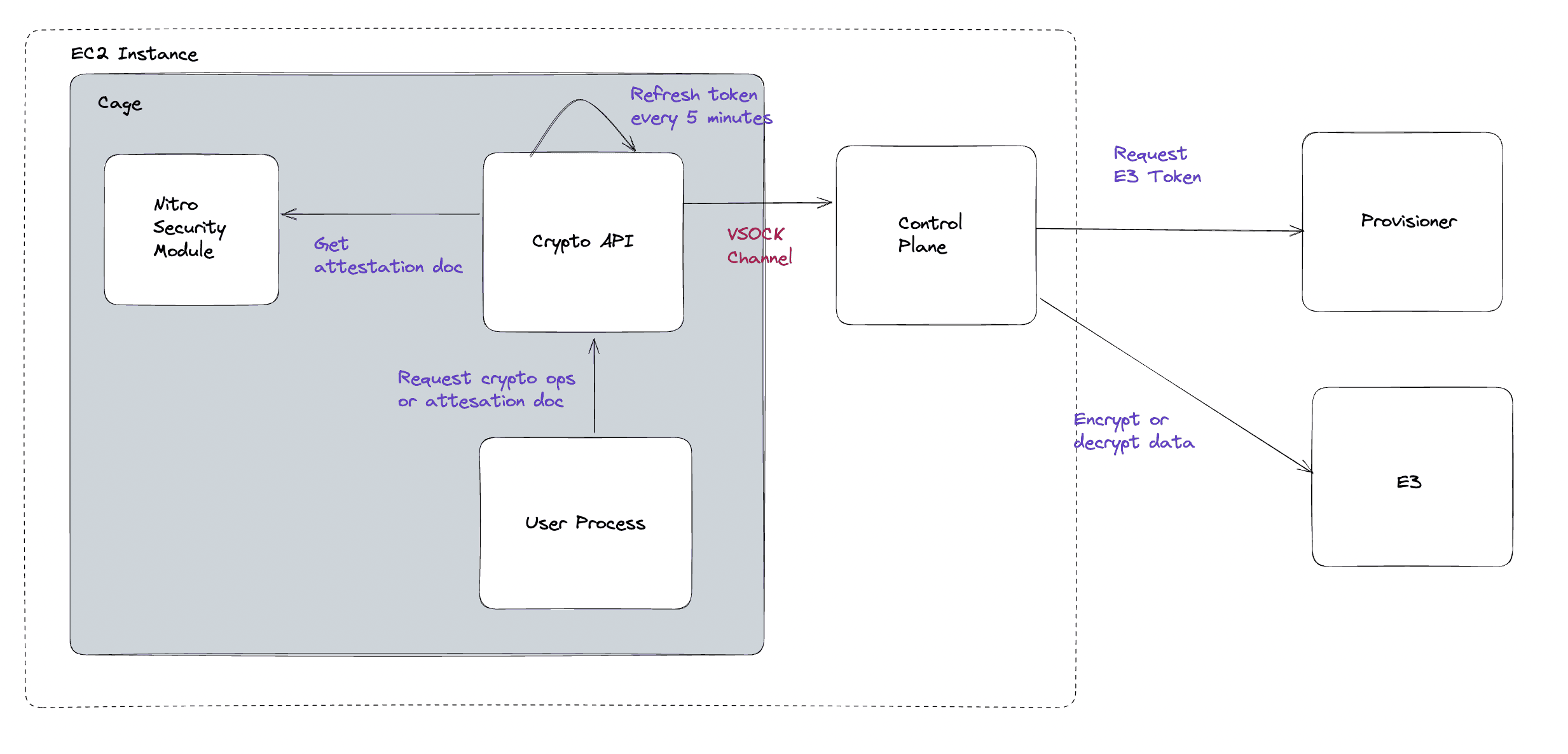 /encrypt/decrypt/attestation-docThe Crypto API runs on loopback, and the user process can access it on 127.0.0.1:9999. It proxies traffic over to the control plane, which will route the request to E3 for encryption or decryption.