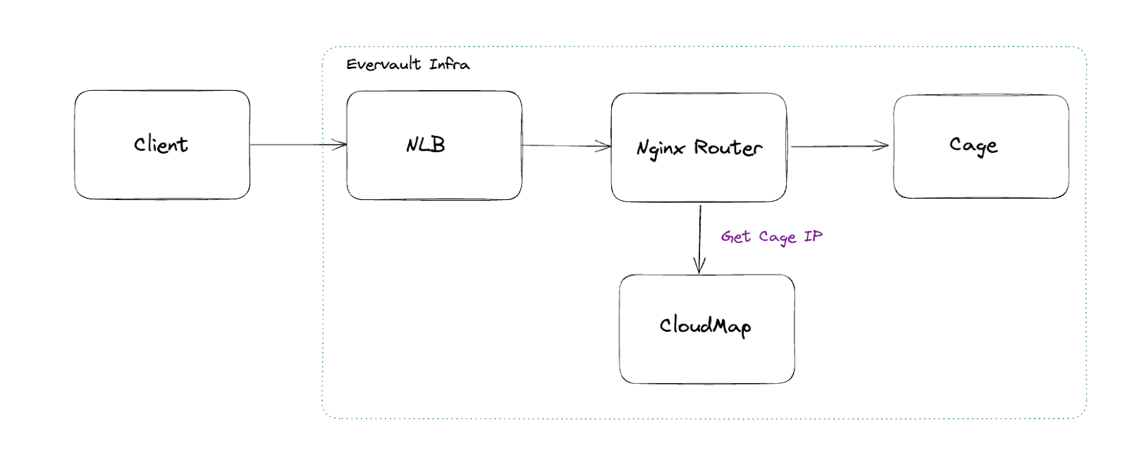 Ingress requests hit an NLB that sits in front of an Nginx routing layer that will route traffic to a specific Cage. Cages are assigned a hostname based on the following structure: `{cage_name}.{app_uuid}.cages.evervault.com`, and the internal IP of the service is registered in Cloudmap on startup. When Nginx receives a request, the SNI will be parsed to find the Cage name and app uuid and the request will be routed to the Cage based on the IP obtained from Cloudmap.