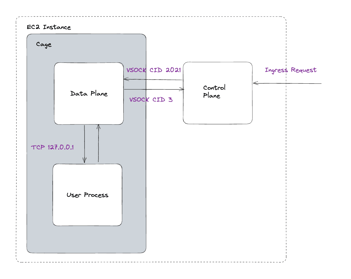 In order to facilitate this, the loopback interface is created on startup using ifconfig. This allows applications to talk to each other on 127.0.0.1 within the Cage. Any traffic that goes to or from the user process is over loopback via the data plane. The control and data plane have a series of VSOCK servers and clients that facilitate communication over the channel. The data plane will send traffic to the user process on the port that is specified in its Dockerfile during Cage build.