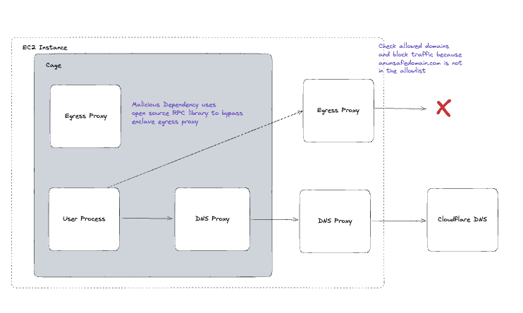 We enforce it in the control plane too, because there is the possibility of an extremely contrived supply chain attack that would target a Cage user and use RPC to make a request out of the enclave, bypassing the enclave egress proxy. By enforcing the same logic in the control plane we protect against this.