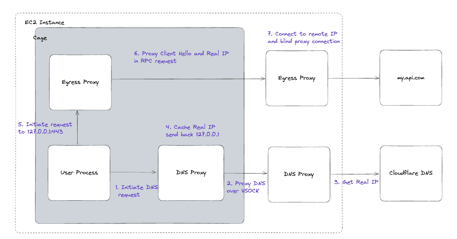 An egress proxy listening on loopback on port 443 will receive the request from the user process. The egress proxy will then parse the hostname from the TLS client hello and lookup the real IP from the cache. An RPC request will then be made with the real remote IP, port, and the Client Hello bytes sent from the user process.