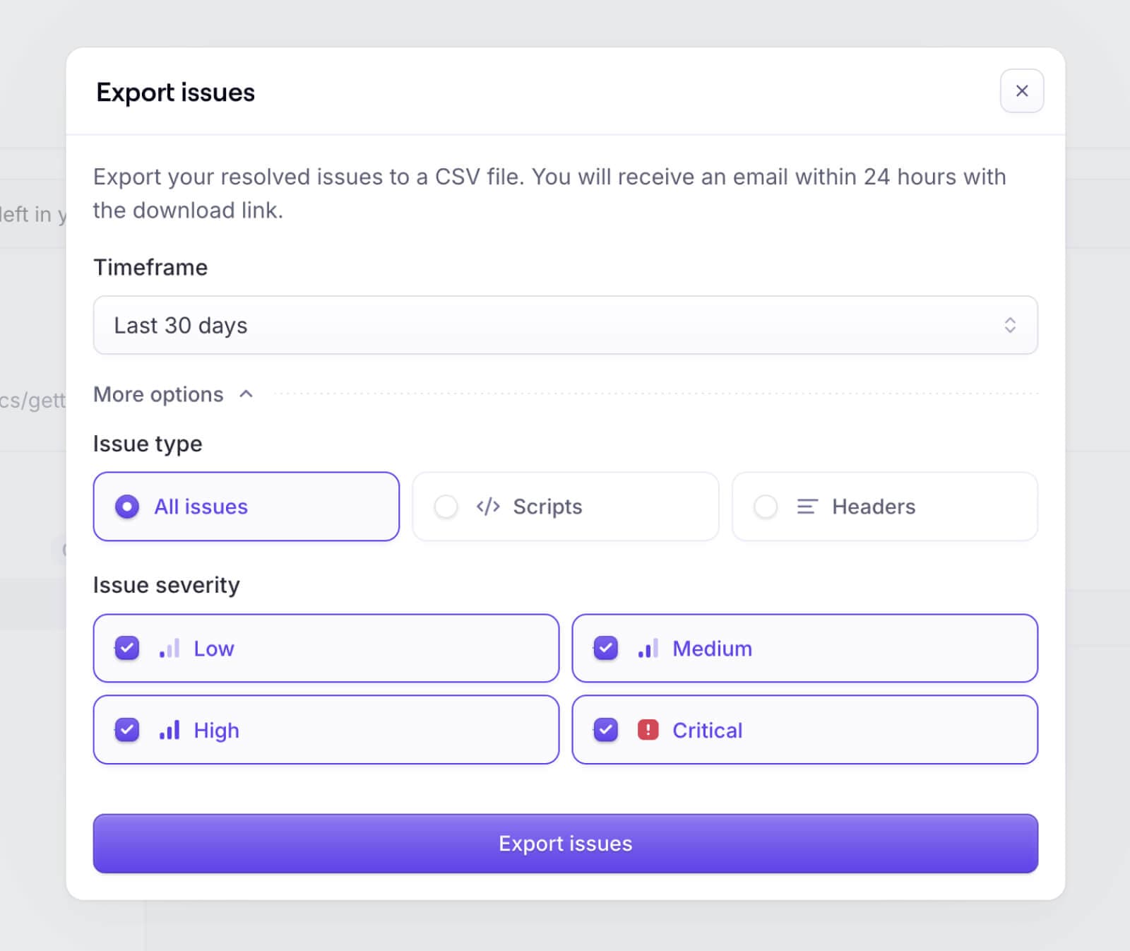 You get a complete catalog of every script running on your payment pages, grouped by risk severity (based on potential impact to your page security) to help you identify which ones shouldn't be there.