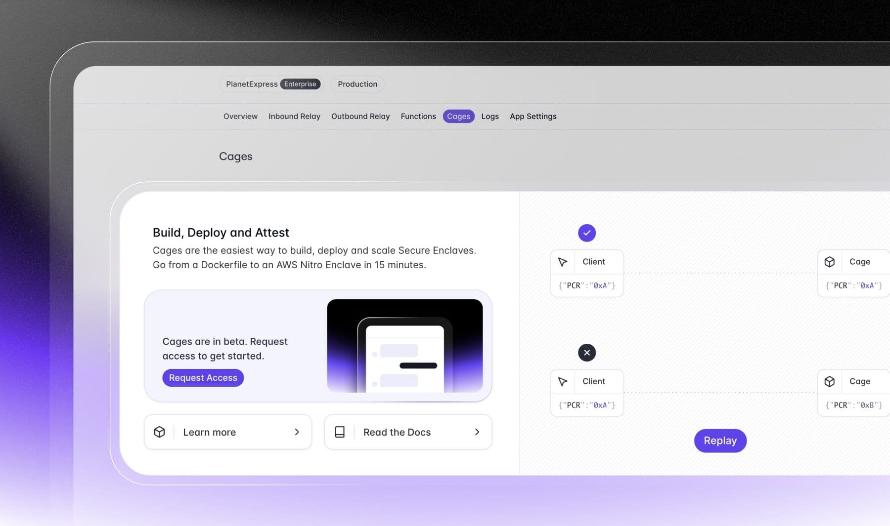 In a recent effort to shorten the “time-to-encrypt” for new Evervault users, we entirely reworked empty states across the Evervault dashboard. Now, each product empty state includes a short description, an animated architecture diagram, and some resources to help you get started.