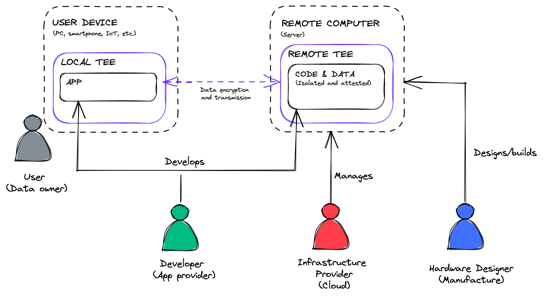 Fig. 2: Secure and trusted remote computation. The diagram includes all the parties involved in the cloud computing paradigm. The diagram includes “local TEEs” and “remote TEEs” because most computers will (do) have some form of secure enclave. (TEEs have their origin in mobile devices (See (Ekb14))). This is one reason for our closing comment that all computations should (will) be trusted computations (isolated and attested). (Note: not all computations will be performed inside the TEE.)