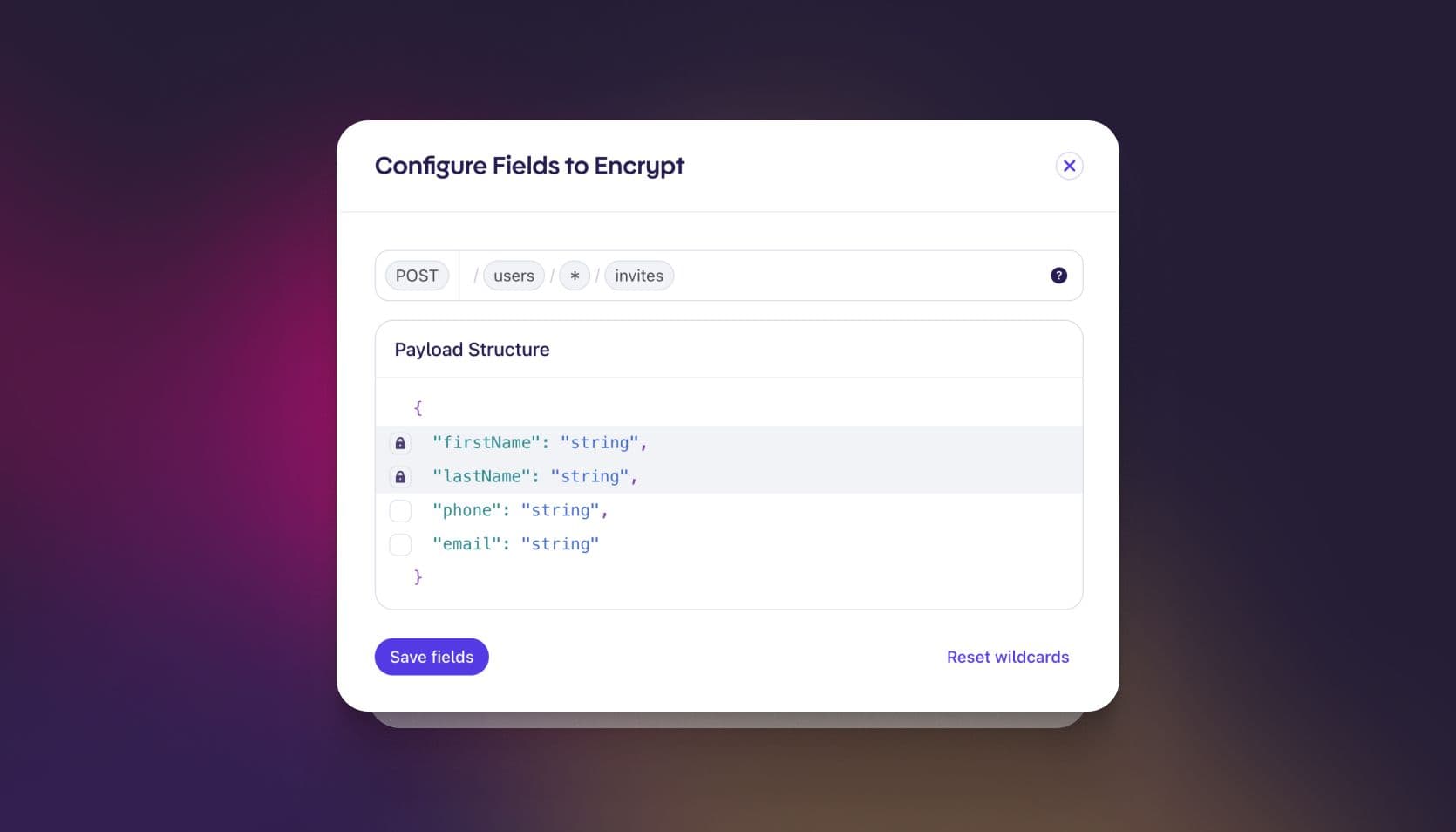 When you choose a request from the last 24 hours, we'll build an interactive map of the JSON payload, allowing you to quickly select any fields you'd like to encrypt.