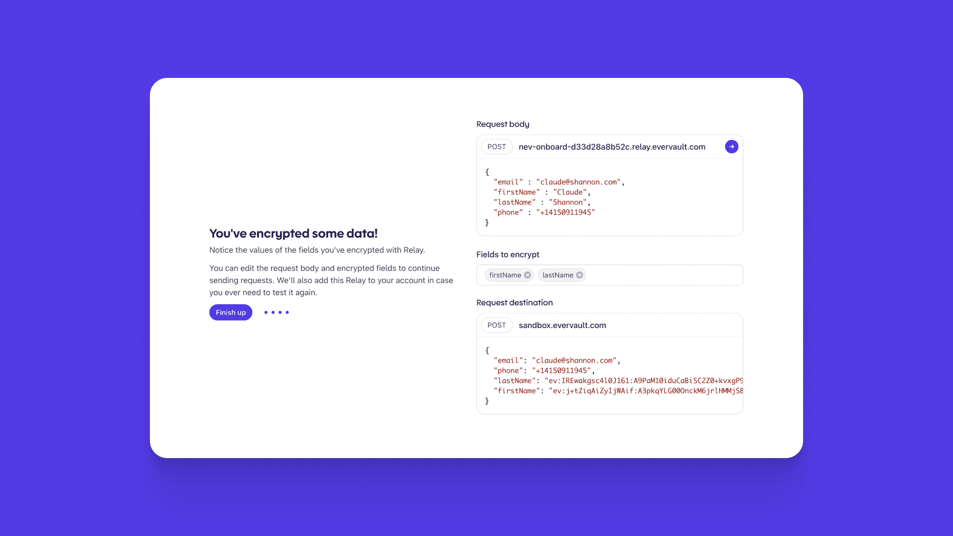 Over the last number of weeks, we've been rolling out a new onboarding experience for first-time Evervault users. The feature is a contextual tutorial that allows users to send JSON data through a configurable Sandbox Relay and watch as it gets encrypted in realtime. Why? Better onboarding which decreases time-to-first-encryption will improve user proficiency and retention.