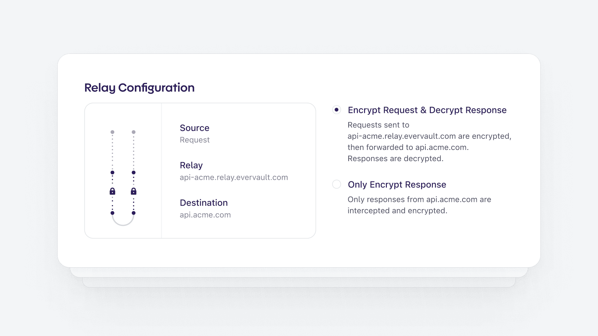 When a request is sent through an Evervault Relay, some fields are encrypted — as defined by you in the Evervault Dashboard. This payload (which is a mixture of plaintext and ciphertext) is sent to the Relay’s pre-configured destination — your API — which you also define in the Dashboard.